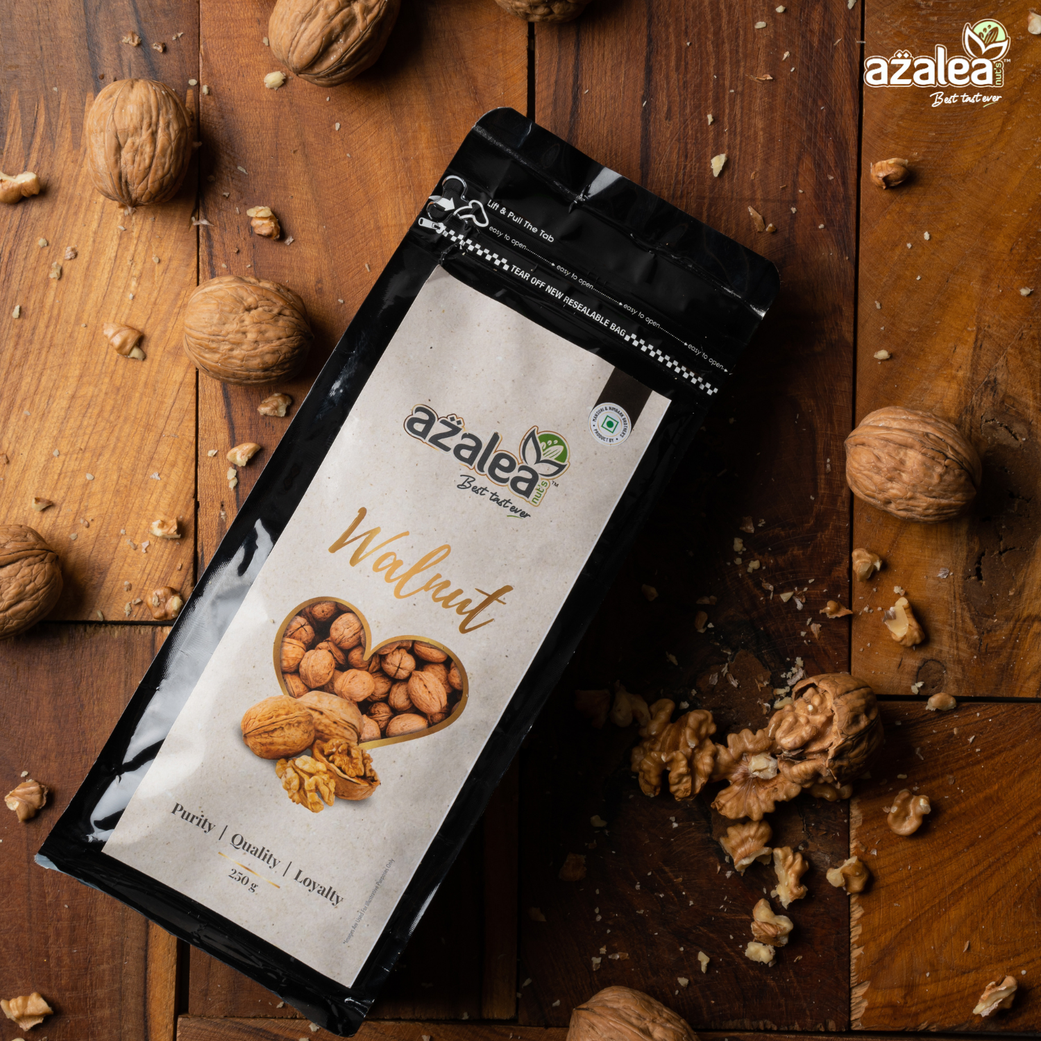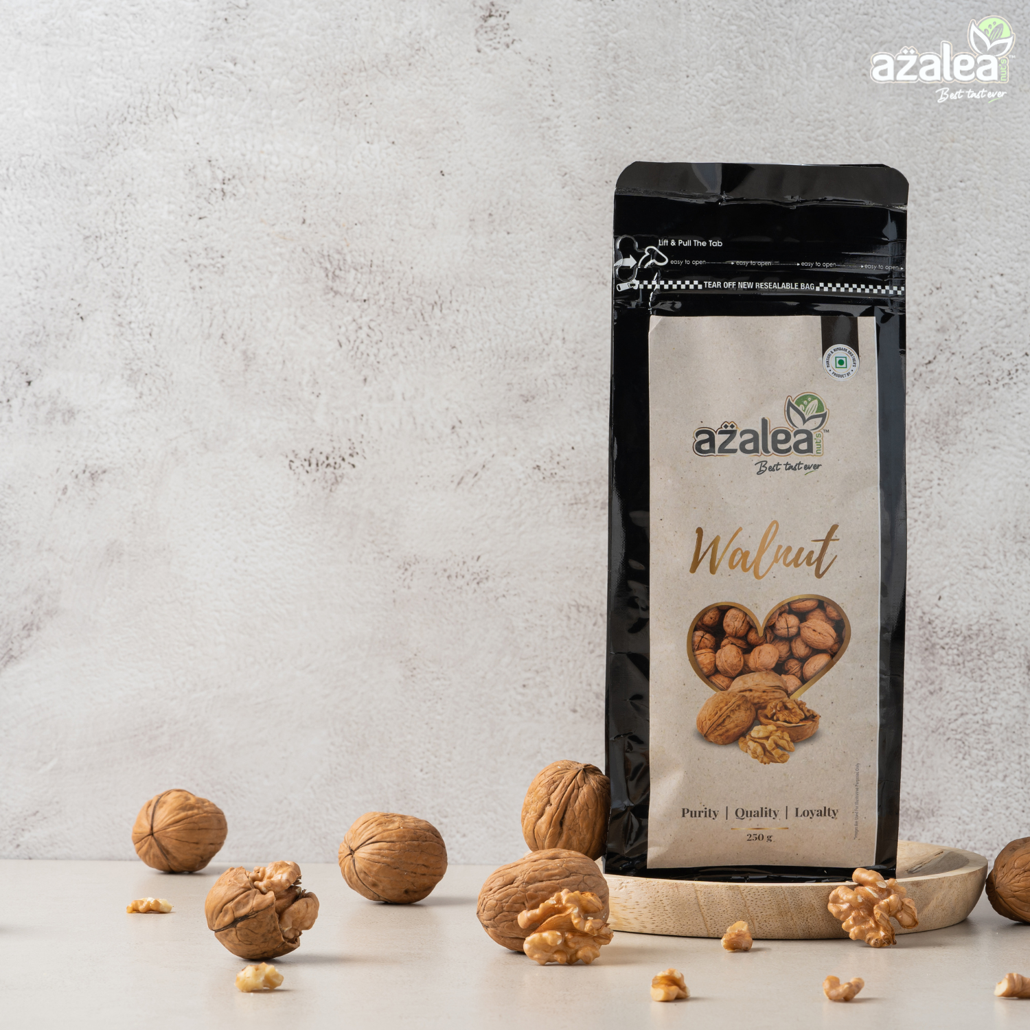 Our Azalea Nuts In-Shell Walnuts 250gm pack features whole, naturally harvested california akhrot. Each shell holds a golden-brown kernel that's not just crunchy and fresh, but a powerhouse of nutrients known for boosting brain health, heart wellness, and immunity.