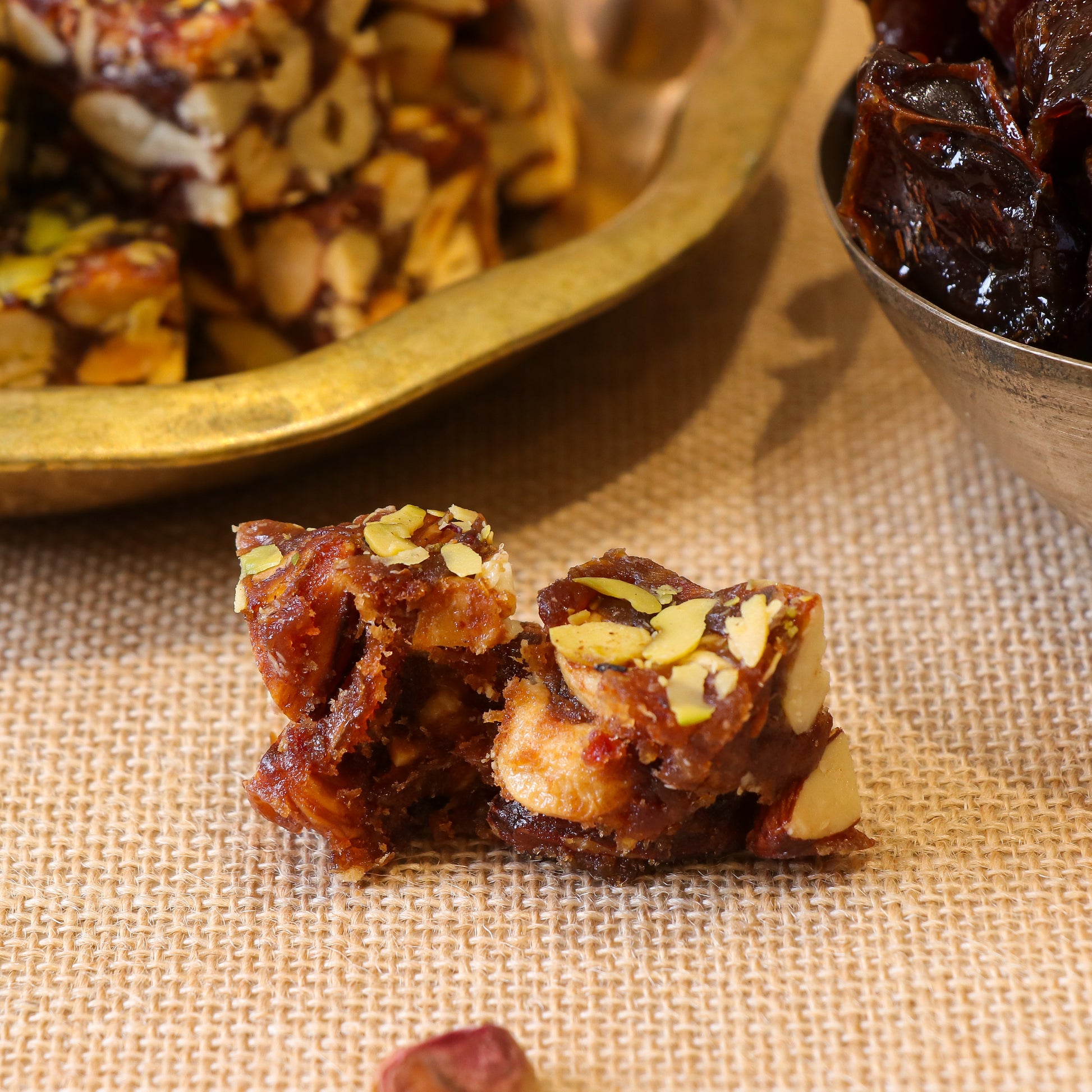 Our chikki is handcrafted using premium dry fruits like almonds, cashews, pistachios, and Saudi dates — all bound with pure honey and desi A2 cow ghee. No refined sugar, no preservatives, just wholesome goodness in every bite.
